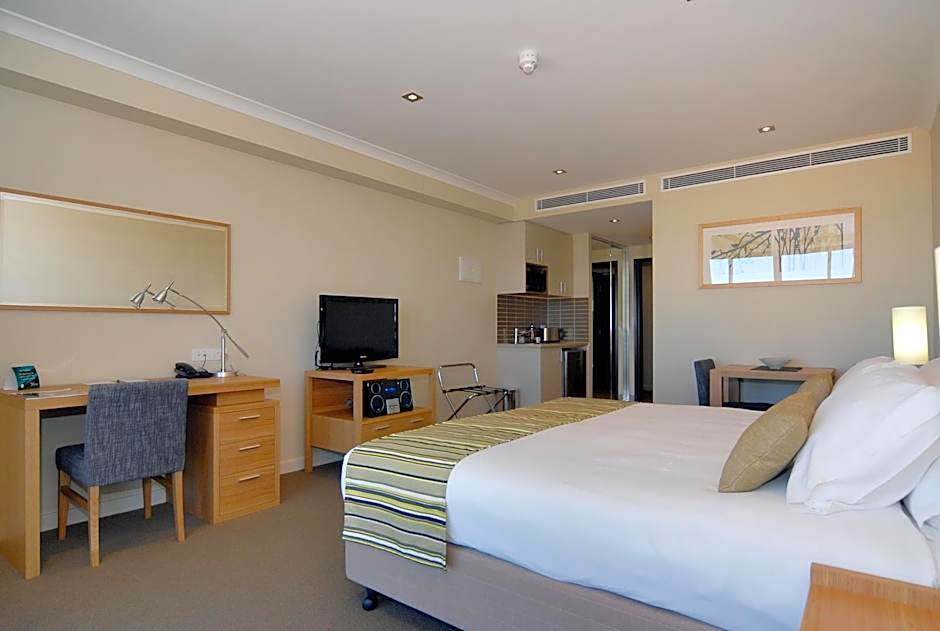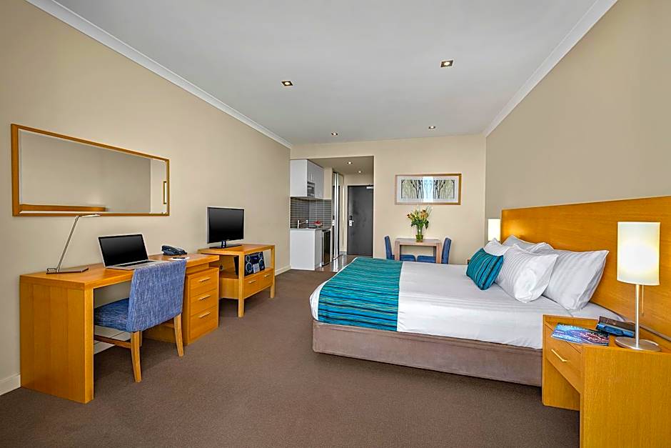 Located in the 'East Tower', across the road from the main reception, the well-appointed Studio Deluxe features natural light and provides a stylish, open-plan space to unwind. It offers apartment-controlled heating/air conditioning and a kitchenette with cooktop, bar fridge, toaster, kettle and microwave. The en suite includes a shower, bathroom amenities, laundry and a hair dryer. Also provided is a desk, LCD TV with Netflix access, and high-speed internet access. A wardrobe, ironing facilities and a private safe add to the convenience.
