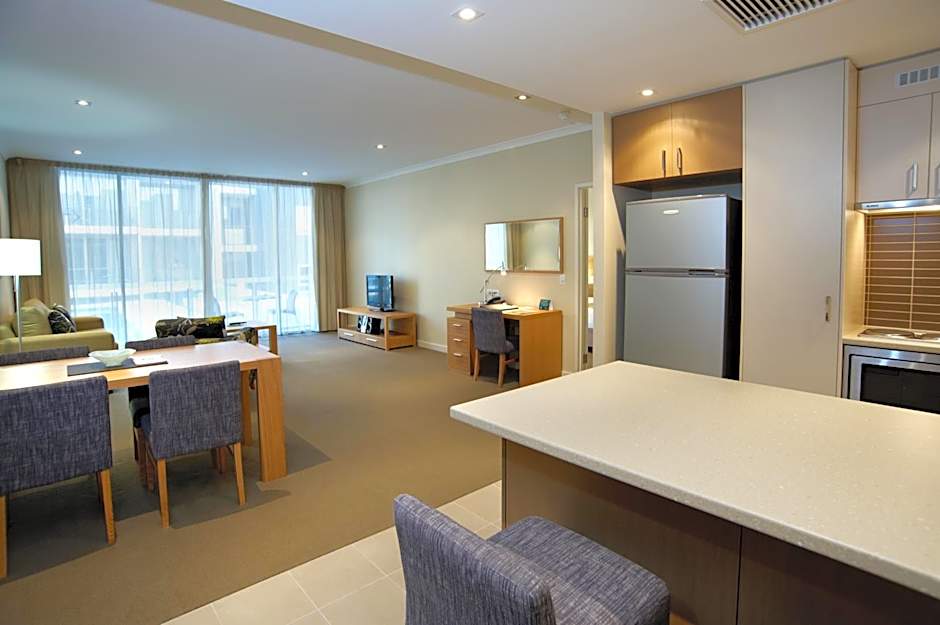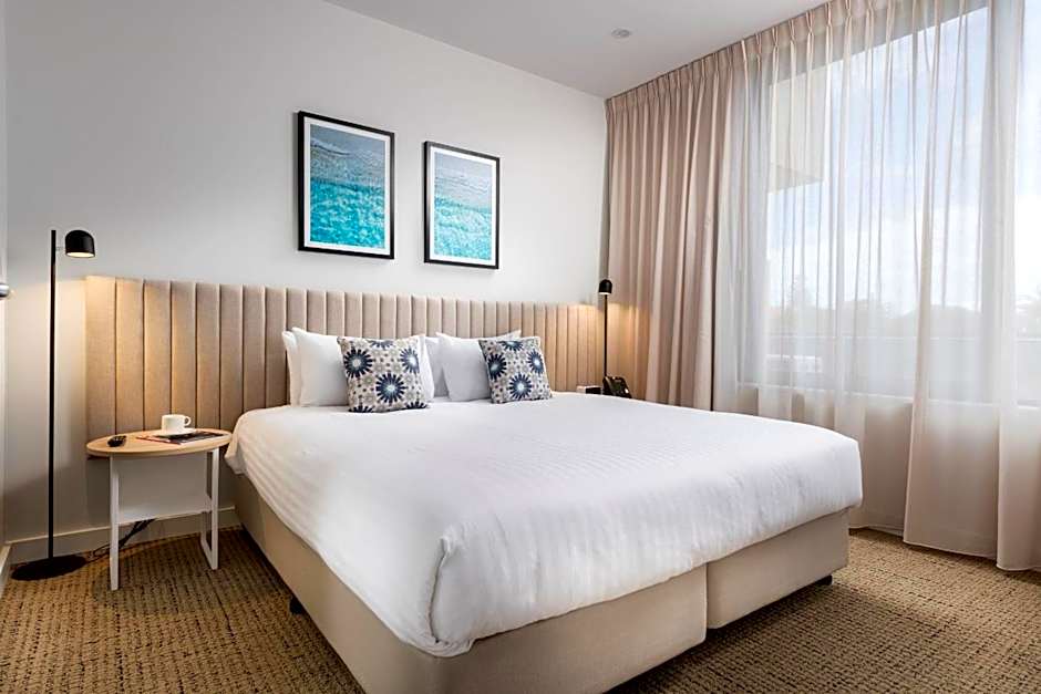 Enjoy the south-facing coastal views from your private balcony in the Executive Studio. The studio provides a stylish, open-plan space to unwind. It includes a king bed or 2 single beds, apartment-controlled heating/air conditioning and a kitchenette with a bar fridge, toaster, kettle, and microwave. The private bathroom has a shower over bathtub, bathroom amenities and a hair dryer. Also provided is a desk, LCD TV with cable channels and high-speed internet access. A wardrobe, ironing facilities and a private safe add to the convenience.