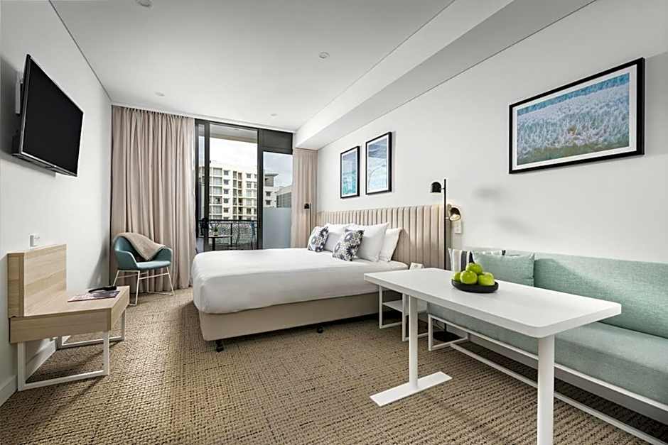 Suitable for families or small groups, the Two-Bedroom Apartment provides a blend of space and privacy. The apartment is a Studio interconnected with a One Bedroom Apartment. It consists of 2 bathrooms, with a shower over bathtub and laundry facilities. Both bedrooms can be configured as either a king bed or two single beds. The kitchen features a cooktop, full-size fridge, microwave and dining table meaning meals can be prepared and enjoyed in the apartment. Also featured are two private balconies or two courtyards, with pool or street views.